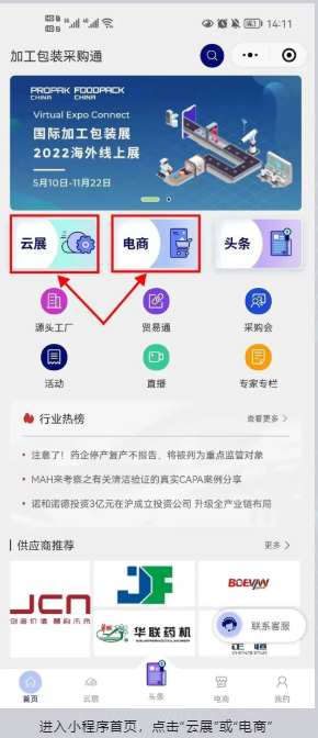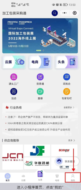 “上(shàng)海(hǎi)加工(gōng)包裝聯展(ProPak China & FoodPack China)”攜手“制(zhì)藥包裝展(P-MEC)”,于2022年(nián)11月(yuè)22日(rì)-2023年(nián)1月(yuè)20日(rì)期間(jiān)在“加工(gōng)包裝采購(gòφu)通(tōng)”小(xiǎo)程序平台上(shàng)推出“雲上(shàng)貿易季”系列活動,助力企業(yèγ)線上(shàng)獲訂單、拓市(shì)場(chǎng)。
