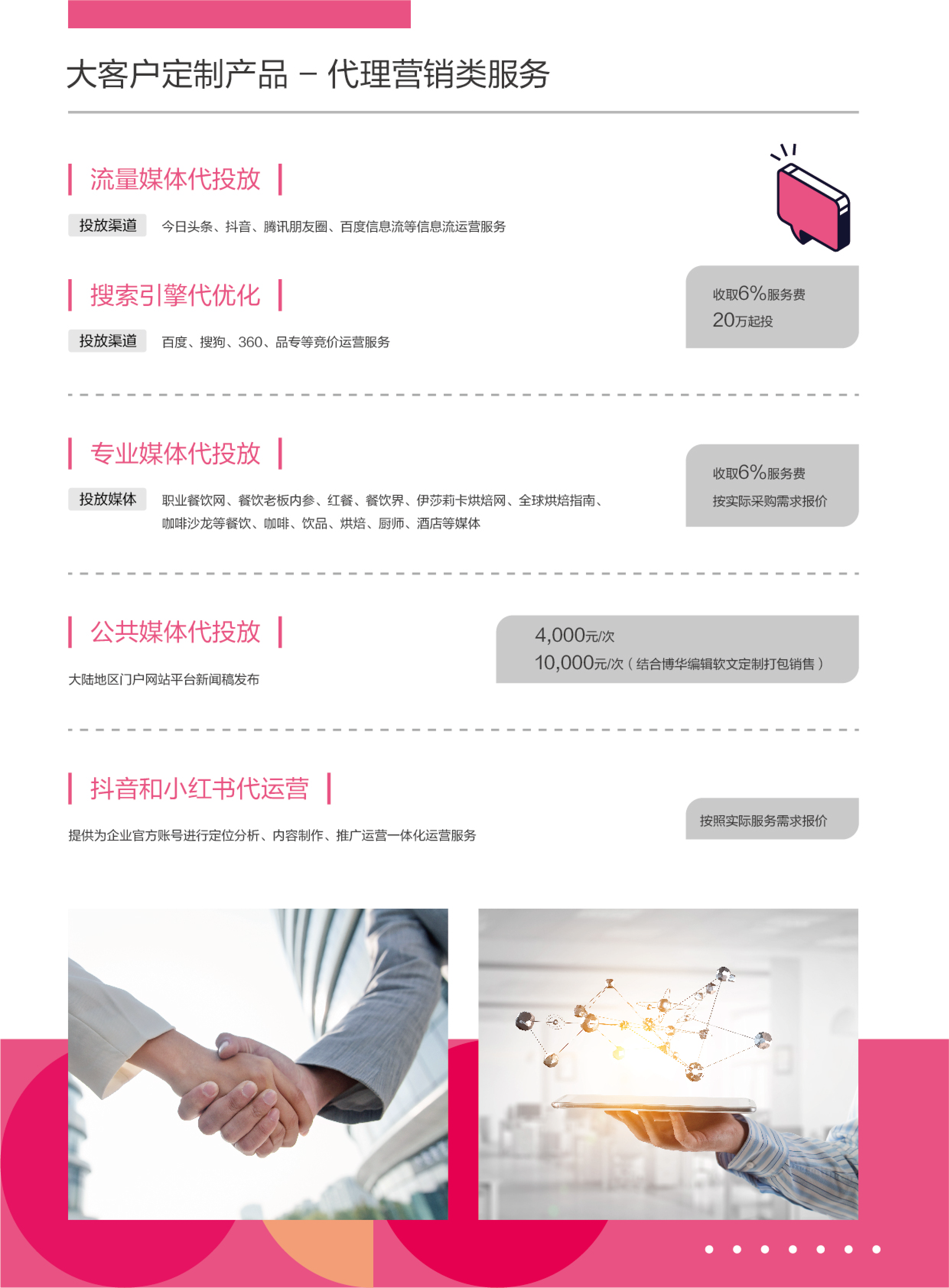 通(tōng)過自(zì)身(shēn)優質的(de)數(shù)字化(huà)投放(fàng)及運營能(néng)力,運用(yòng)數(shù)字化(huà)工(gōng)具為(wèi)✔客戶提供包括流量媒體(tǐ)投放(fàng),搜索引擎優化(huà),企微(wēi)管家(jiā)SaaS,企微(wēi)私域運營陪跑項目,直播執行(xíng)等≤服務。