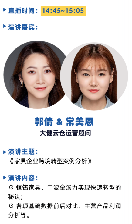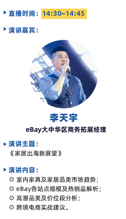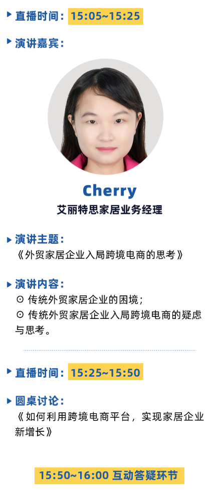 為(wèi)廣大(dà)外(wài)貿家(jiā)具家(jiā)居企業(yè)量身(shēn)打造的(de)“行(x♦íng)業(yè)探索系列公開(kāi)課-跨境電(diàn)商專場(chǎng)”又(yòu)将來(lái)襲。本次線✘上(shàng)直播特邀中國(guó)國(guó)際家(jiā)具展覽會(huì)的(de)戰略合作(zuò)夥伴,指定外(wài)貿B2B交易平台–大(dφà)建雲倉,以及e-Bay, 艾麗(lì)特思家(jiā)居的(de)5位行(xíng)業(yè)打卡,帶來(lái)他(t∏ā)們各自(zì)的(de)洞察和(hé)分(fēn)享,為(wèi)更多(duō)外(wài)貿家(jiā₹)居企業(yè)解惑。