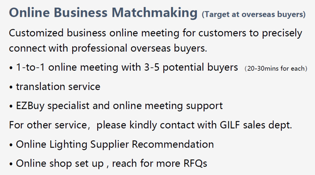 The online business matching service aims to establishπ a platform for efficient cooperation between the s♠upply and demand sides with the principle of “accurate matchi ng, cost reduction and efficiency improvement”. Our specialists ♥would connect, screen and match for both sides ,expanding procurement channe¶ls for buyers and connecting target customers for exhibitors. The busi≠ness matching services covers the industries from architecture, interior ®design & decoration to intelligent control, c≠leaning operation and maintenance, franchising and other sub-sectors.